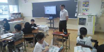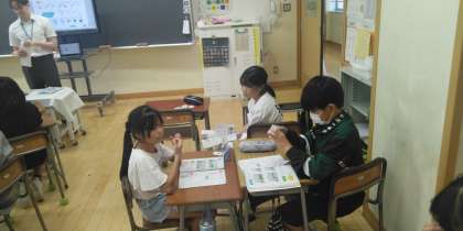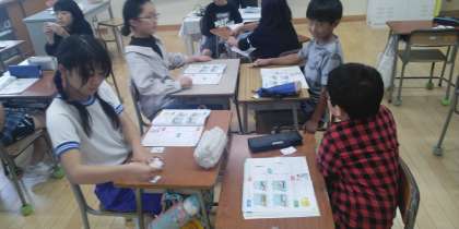 4年2組の6時間目は、外国語活動の時間でした。カードを使って中身あてゲームをしていました。