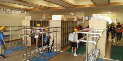 今朝の児童玄関の様子です。日光もさしていて、気持ちのよい朝です。