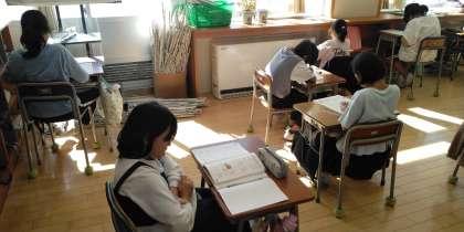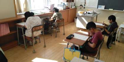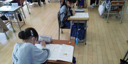 4年1組の4時間目は、算数科の学習でした。わり算のプリントを解いていました。
