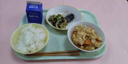 今日の給食です。 【献立】 ごはん 牛乳 さばのみそ煮 いり大豆和え 卵とじ です。