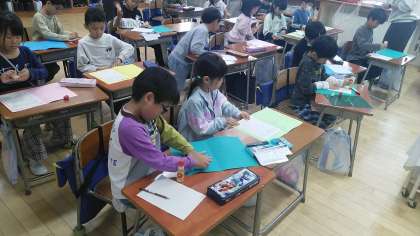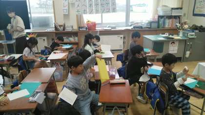 1年生は、3時間目に「どくしょちょきん」のカードをつくっていました。のりの使う量をちゃんと考えて紙を貼っていました。