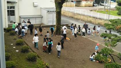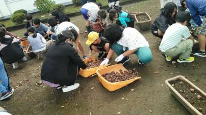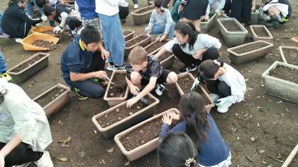 今日は、赤団の人たちがプランターにチューリップの球根を植えました。8つずつ植えているらしいです。