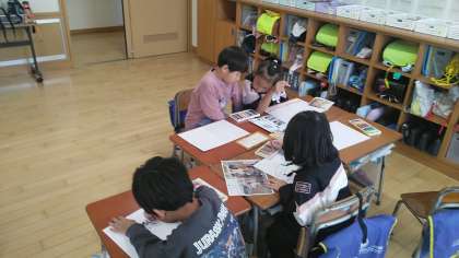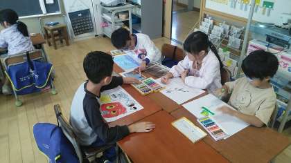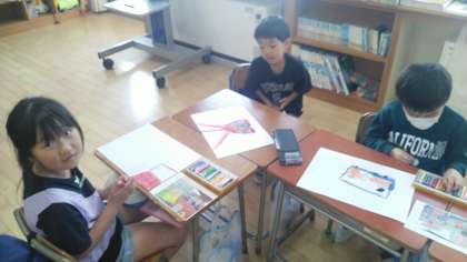 1年生の1時間目は、図画工作科の学習でした。魚津水族館やミラージュランドに行った校外学習の絵を描いていました。写真等を見ながら、行った時のことを思い出しながら描いていました。