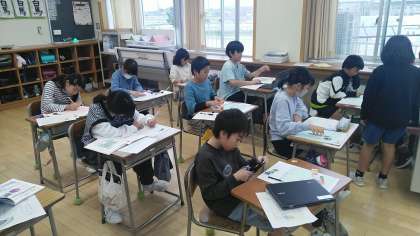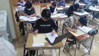 4年2組は、6時間目にカード(ポスター)をかいていました。「ごみを拾う」など、SDGsに関係するものをつくっていました。