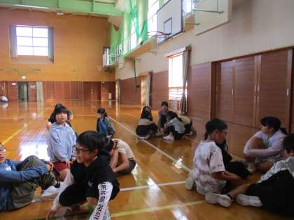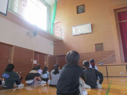 4年1組の2時間目は、道徳科の学習でした。体育館で校歌の歌詞を口ずさみながら、気に入った言葉を見付けたり、そこに込められた作曲者の願いを考えたりしました。