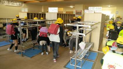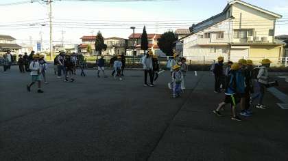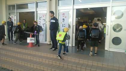 今朝の児童玄関の様子です。天気ですが、風はだいぶん冷たいです。元気な子供たちが登校してきました。
