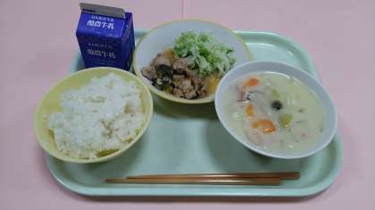 今日の給食です。 【献立】 ごはん 牛乳 あっさりチキン ゆでキャベツ 秋の香りシチュー です。