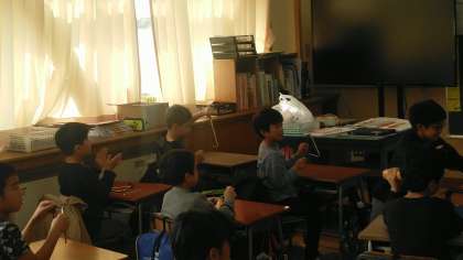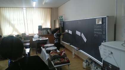 2年生の3時間目は、音楽科の学習でした。トライアングルやウッドブロック等、自分の好きな楽器を選んでリズムうちしていました。
