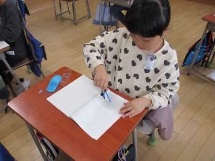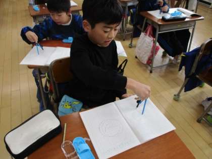 算数科では、円についての学習に取り組んでいます。今日は、初めてコンパスで円をかいてみました。途中で針が抜けてしまったり、ずれてしまったりとなかなか苦戦していました。これから練習を重ねて上達していきます。