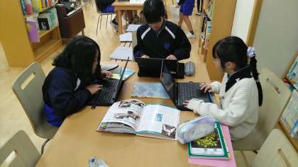 4年2組の1時間目は、国語科の学習でした。伝統工芸品について図書室で調べていました。