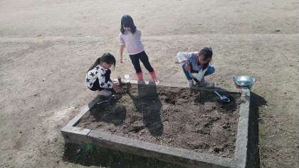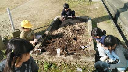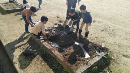 1年生の3時間目は、生活科の学習でした。花壇を使ってどろあそびをしていました。土を掘ったり、水を加えたりしながら楽しんでいました。