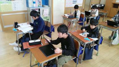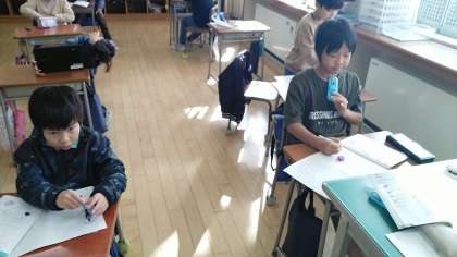 3年生の1時間目は、算数科の学習でした。コンパスや円の問題を解いていました。