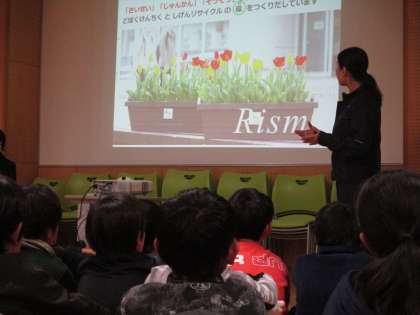 3、4年生の5時間目は、外部講師を迎えて、プラスチックのリサイクルからつくられたプランターに、チューリップの球根を植えました。プラスチックをリサイクルしたプランターを興味深げに眺める様子が見られました。