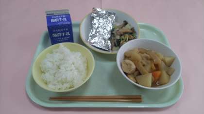 今日の給食です。 【献立】 ごはん 牛乳 さばの銀紙焼き しめじのごま和え 関東だき です。