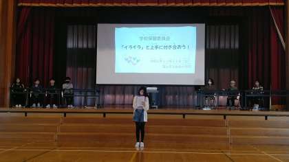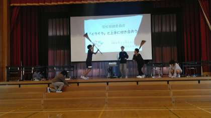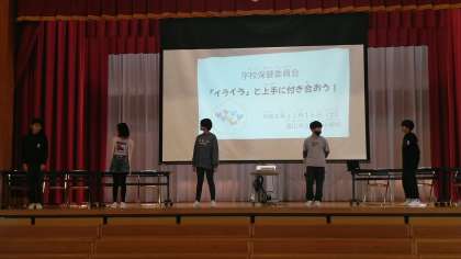 健康委員会が中心となって、土曜日に行う「学校保健委員会」のリハーサルを行っていました。テーマのイライラについて、見ている人に伝えようと一生懸命発表していました。本番は、土曜日です。がんばれー。