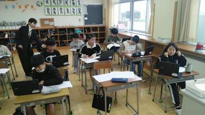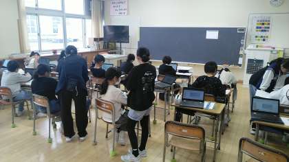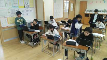 4年2組の1時間目は、国語科の学習でした。「未来につなぐ工芸品」という説明文の学習中で、自分たちが調べた伝統工芸品について、クロームブックでまとめていました。