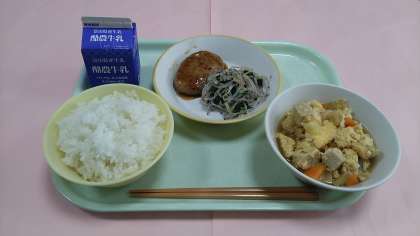 今日の給食です。 【献立】 ごはん 牛乳 照り焼きハンバーグ ゆかり和え 卵とじ です。