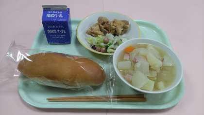 11月19日(火)の給食 公開日 2024/11/19 更新日 2024/11/19 学校から 今日の給食です。 【献立】 コッペパン 牛乳 鶏肉のから揚げ ミックスビーンズのマリネ 野菜のスープ煮 です。