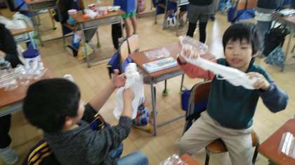 3年生の5時間目は、図画工作科の学習でした。「空きようきのへんしん」という学習で使う紙粘土(とっても軽くてのびやすいふわふわしたねんど)をこねてひっぱっていました。とっても触感が気持ちいいです。