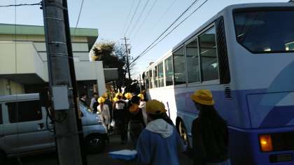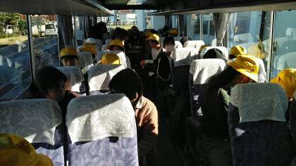 6年生が校外学習に出かけました。送迎バスに乗ってガラス工房に向かいました。