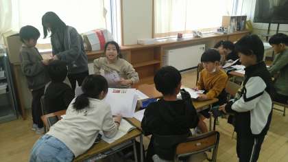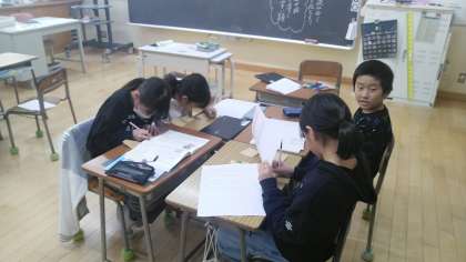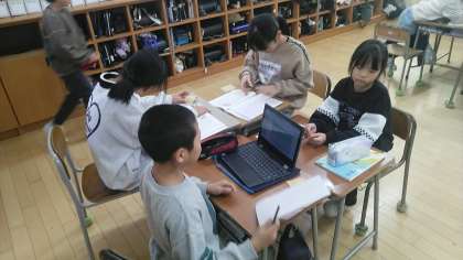 4年2組の6時間目は、国語科の学習でした。伝統工芸品について調べてつくったリーフレットを見せ合って意見を聞いていました。