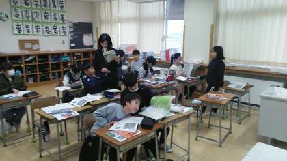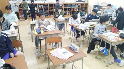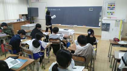 4年2組の5時間目は、社会科の学習でした。昔と今の神通川の川幅や曲がりかた等を調べていました。昔はすごく曲がっていました。