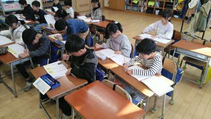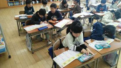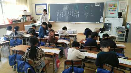 1年生の1時間目は、国語科の学習でした。「竹」と「月」と「車」という漢字の練習をしていました。