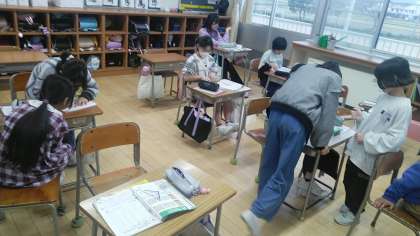 4年1組の5時間目は、算数科の学習でした。四角形の特徴を生かして、ドットを使って線を引いていました。