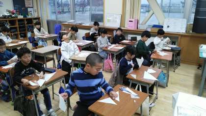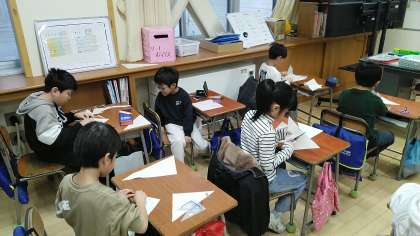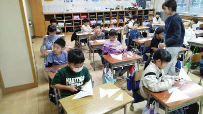 2年生の1時間目は、算数科の学習でした。紙をハサミで切って、直角三角形をつくって分かったことを発表していました。