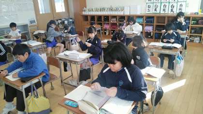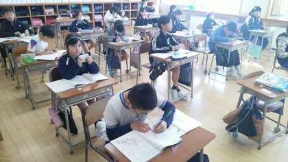 4年1組の1時間目は、算数科の学習でした。長方形から直角三角形を切り取って反対側につけるとどんな図形になるかを考えていました。「平行四辺形だ。」すぐに答えていました。