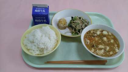 今日の給食です。 【献立】 ごはん 牛乳 にんじんシューマイ 小松菜の大豆そぼろ和え マーボー豆腐 です。