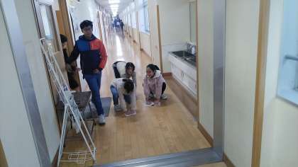 ぞうきんで廊下をふいている子供たちがいました。