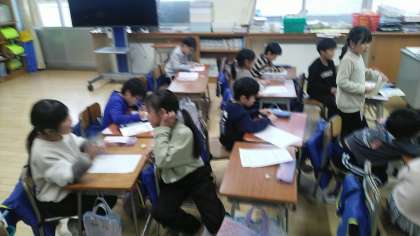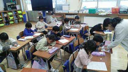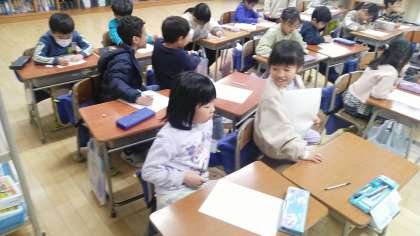 1年生は、5時間目にアンケートをかいていました。教育相談用のアンケートです。時間があったので、裏に「おすすめのたべもの」もかいていました。