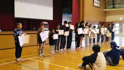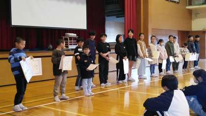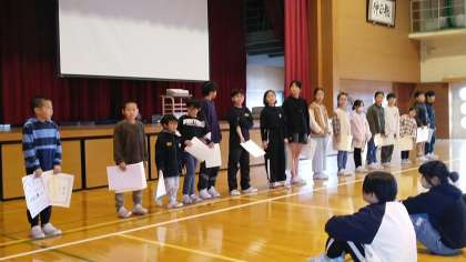 ひいらぎタイムに体育館で受賞紹介を行いました。表彰された皆さん、おめでとうございます。
