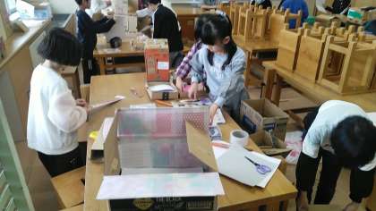4年1組の5時間目は、図画工作科の学習でした。図工室でおもしろ段ボールボックスをつくっていました。