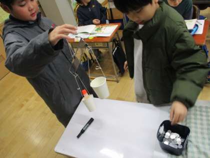 算数の時間に、ものの重さが1円玉何枚分と同じになるかを調べて、「g」の学習をしました。