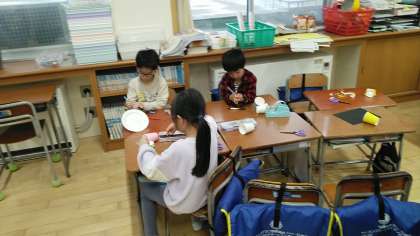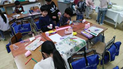 1年生の1時間目は、図画工作科の学習でした。「スルスルビューン」の作品をつくって試していました。