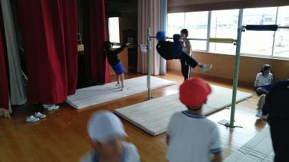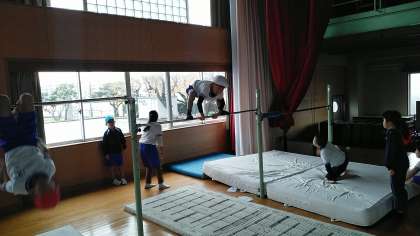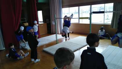 2年生の1時間目は、体育科の学習でした。体育館で鉄棒をしていました。グライダー(飛行機とび)のできている子供もいました。
