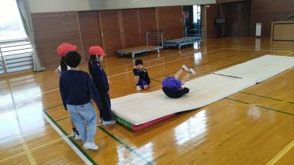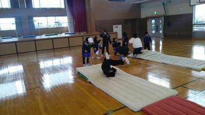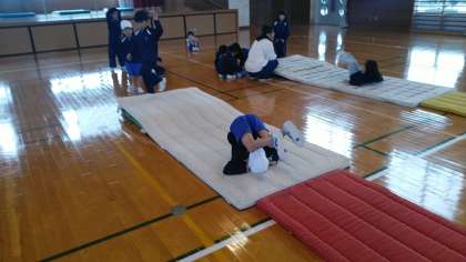 1年生の3時間目は、体育科の学習でした。後転(後ろまわり)の練習をしていました。