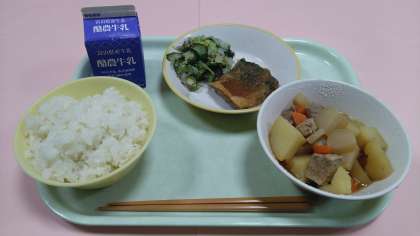 今日の給食です。 【献立】 ごはん 牛乳 揚げ魚のみぞれだれ ゆかり和え 豚肉とじゃがいもの南蛮煮 です。