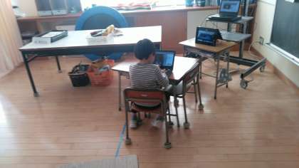 つばめ野級2組の教室を2時間目の終わり頃に覗くと、クロームブックでタイピング練習をしたり、段ボールハウスの修正をしたりしていました。