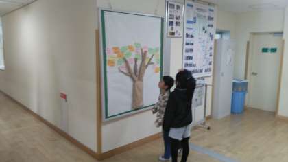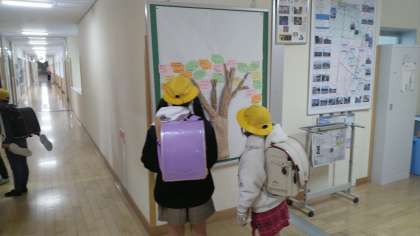 12月11日(水) ぽかぽかの木 公開日 2024/12/11 更新日 2024/12/11 学校から 人権週間の時に説明のあった「ぽかぽかの木」に葉っぱがつきました。ぽかぽかの木のはっぱには、全校のみんなが見付けた「心があたたかくなる言葉」が書かれています。早速、みんな読んでいました。