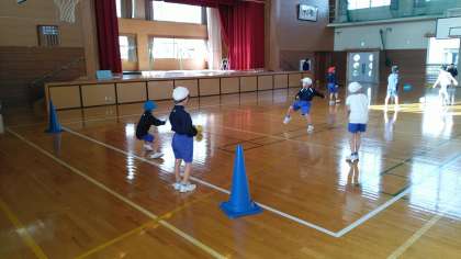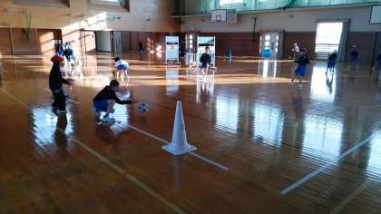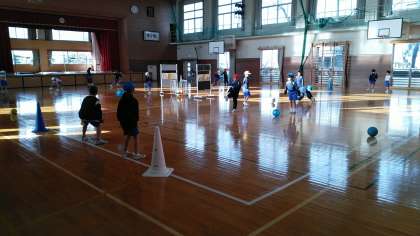 2年生の1時間目は、体育科の学習でした。体育館でサッカーのシュートの練習をしていました。