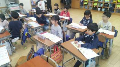 1年生の3時間目は、国語科の学習でした。「森」と「出」という漢字の練習をしていました。