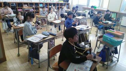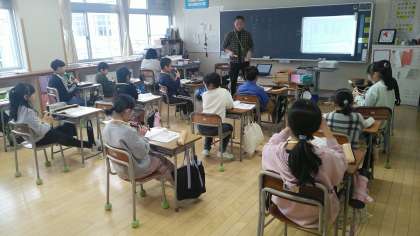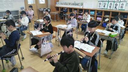 4年1組の3時間目は、音楽科の学習でした。リコーダーの練習で、サミングの練習をしていました。
