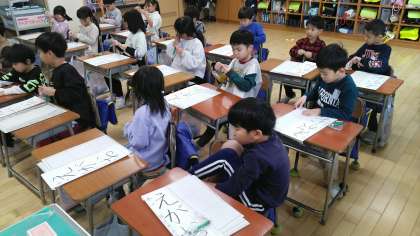 1年生の3時間目は、書写の学習でした。書き初め大会の練習をするところでした。「えがお」という文字を書くそうです。