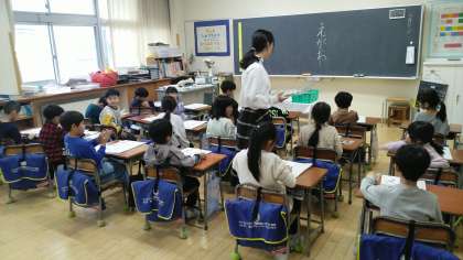 1年生の3時間目は、書写の学習でした。書き初め大会の練習をするところでした。「えがお」という文字を書くそうです。