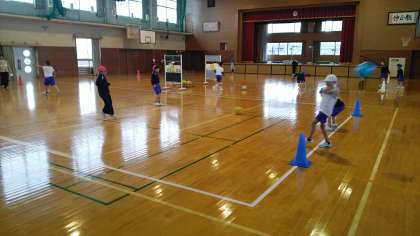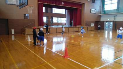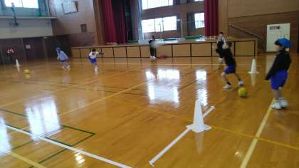 2年生の5時間目は、体育科の学習でした。体育館でサッカーのシュートの練習をしていました。