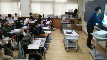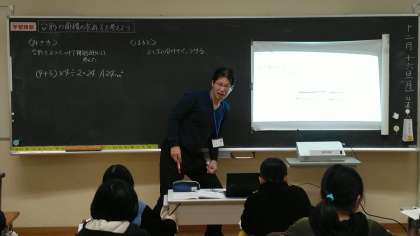 5年生の5時間目は、算数科の学習でした。台形の面積の公式が(上底+下底)×高さ÷2になるわけを平行四辺形の面積を使って考えていました。