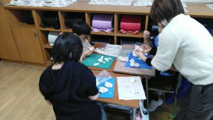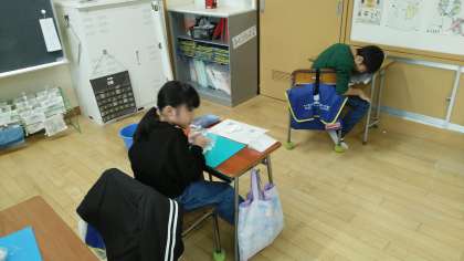 2年生の3時間目は、おもちゃづくりの時間でした。完成に向けてつくっていました。